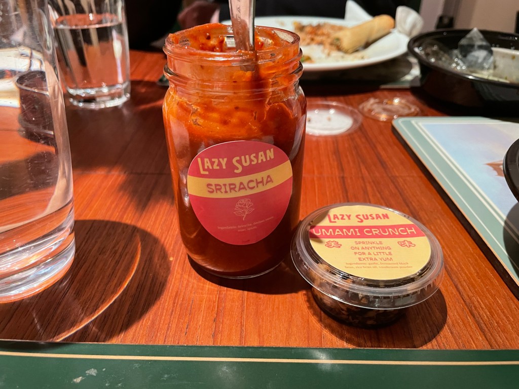 I am often not a big fan of crab rangoon but these actually surprised me in a really good way. Oftentimes, I find that crab rangoon are too big and have too much cream cheese which overwhelms the crab flavor. The crab rangoon from Lazy Susan were the perfect size as they were wrapped in a thin wonton that could be eaten in one to two bites. Also, they had a good ratio of crab to cream cheese that made it so that the flavors balanced well. Overall, I am not usually hyped about crab rangoon but these ones were pretty good.