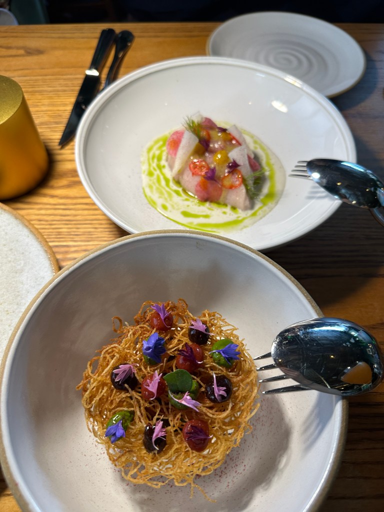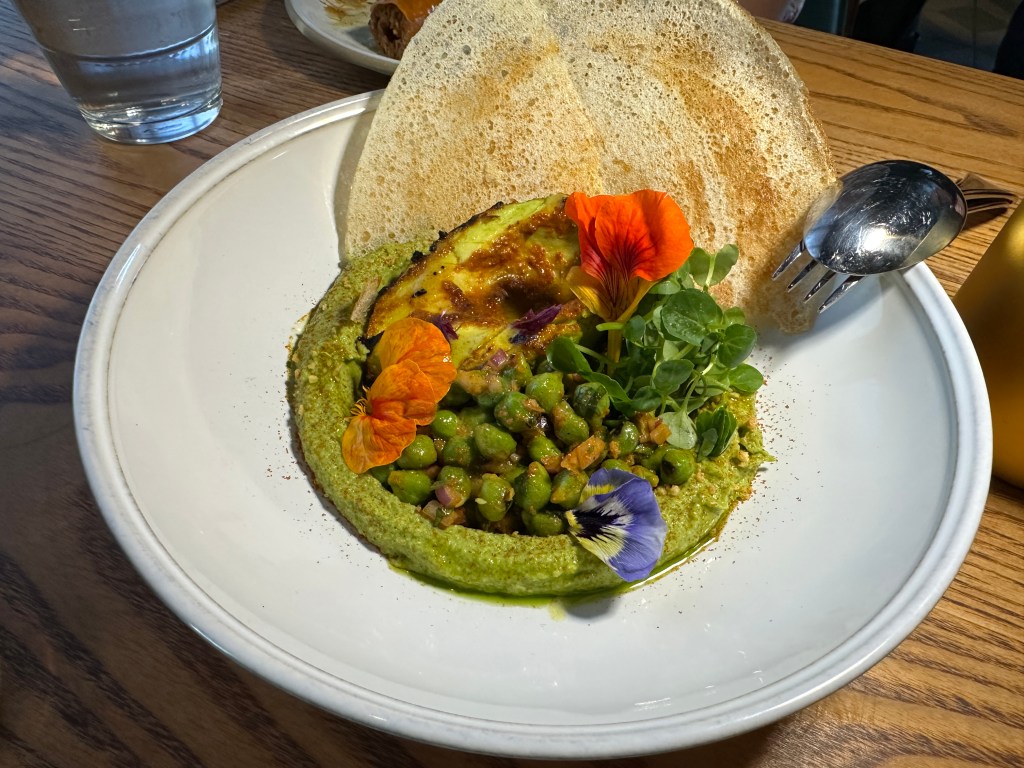 - the chickpea hummus had some fava beans that were left whole which added a great crunch and texture. There was a nice semi mashed avocado which was super fun. And The dosas was light and crispy, the perfect vessel to scoop. Overall a great way to start the meal
